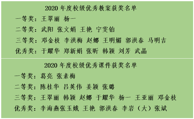 此次活動旨在充分發(fā)揮教案、教學(xué)設(shè)計在教學(xué)中的作用,促進課程教學(xué)內(nèi)容更新、教學(xué)方式與手段轉(zhuǎn)變,不斷提高教師的教學(xué)水平和課堂教學(xué)質(zhì)量。評選分別設(shè)置一等獎、二等獎、三等獎和優(yōu)秀獎。經(jīng)教學(xué)部初評推薦,學(xué)校評審組本著公平、公正、公開的原則,按照優(yōu)秀教案、優(yōu)秀課件評分標(biāo)準(zhǔn)進行評選,王翠麗、武陽、鄧金枝等12位教師分獲優(yōu)秀教案一二三等獎;葛亮、陳桂華、韓穎等13位教師分獲優(yōu)秀課件一二三等獎;于耀華、李海燕等12人獲得教案、課件優(yōu)秀獎。