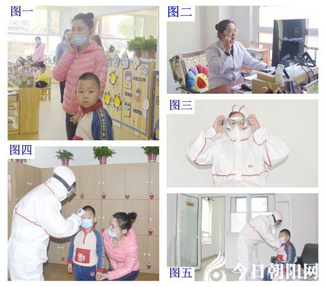 圖一、圖二:中一班有一名幼兒發(fā)燒,班主任報(bào)告保健醫(yī);圖三:保健醫(yī)迅速穿好防護(hù)服;圖四、圖五:保健醫(yī)分別在班級和隔離室為發(fā)燒幼兒測體溫。