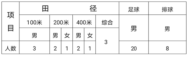 特長生共計(jì)70人,其中體育生40人,包括田徑12人、足球20人(守門員3人)、排球8人;藝術(shù)生30人,包括美術(shù)生15人、音樂生15人。