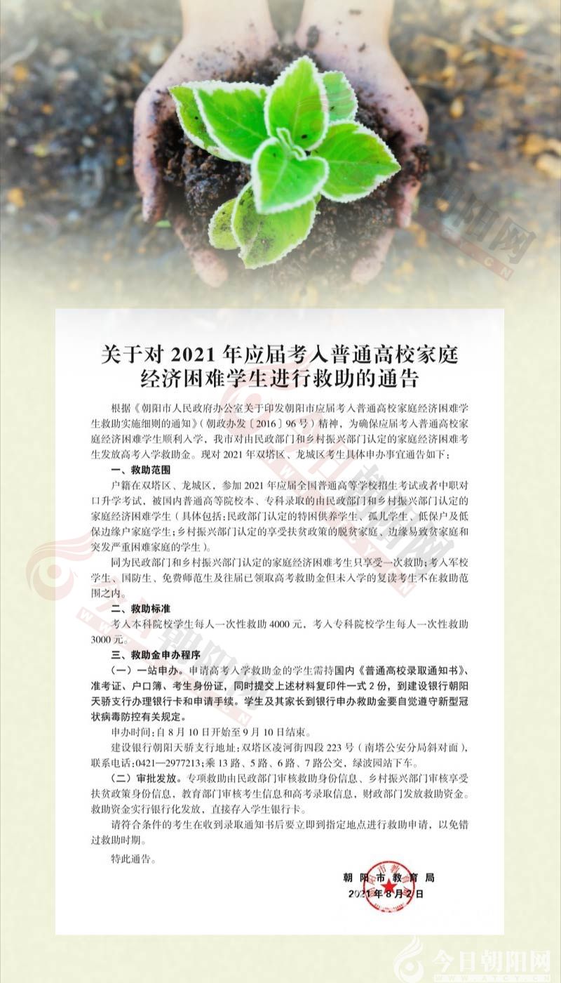 小編在此鄭重提示,本《通告》救助范圍和對(duì)象包括:戶籍在朝陽市雙塔區(qū)、龍城區(qū),參加2021年應(yīng)屆全國普通高等學(xué)校招生考試或者中職對(duì)口升學(xué)考試,被國內(nèi)普通高等院校本、??其浫〉挠擅裾块T和鄉(xiāng)村振興部門認(rèn)定的家庭經(jīng)濟(jì)困難學(xué)生(具體包括:民政部門認(rèn)定的特困供養(yǎng)學(xué)生、孤兒學(xué)生、低保戶及低保邊緣戶家庭學(xué)生;鄉(xiāng)村振興部門認(rèn)定的享受扶貧政策的脫貧家庭、邊緣易致貧家庭和突發(fā)嚴(yán)重困難家庭的學(xué)生)。
