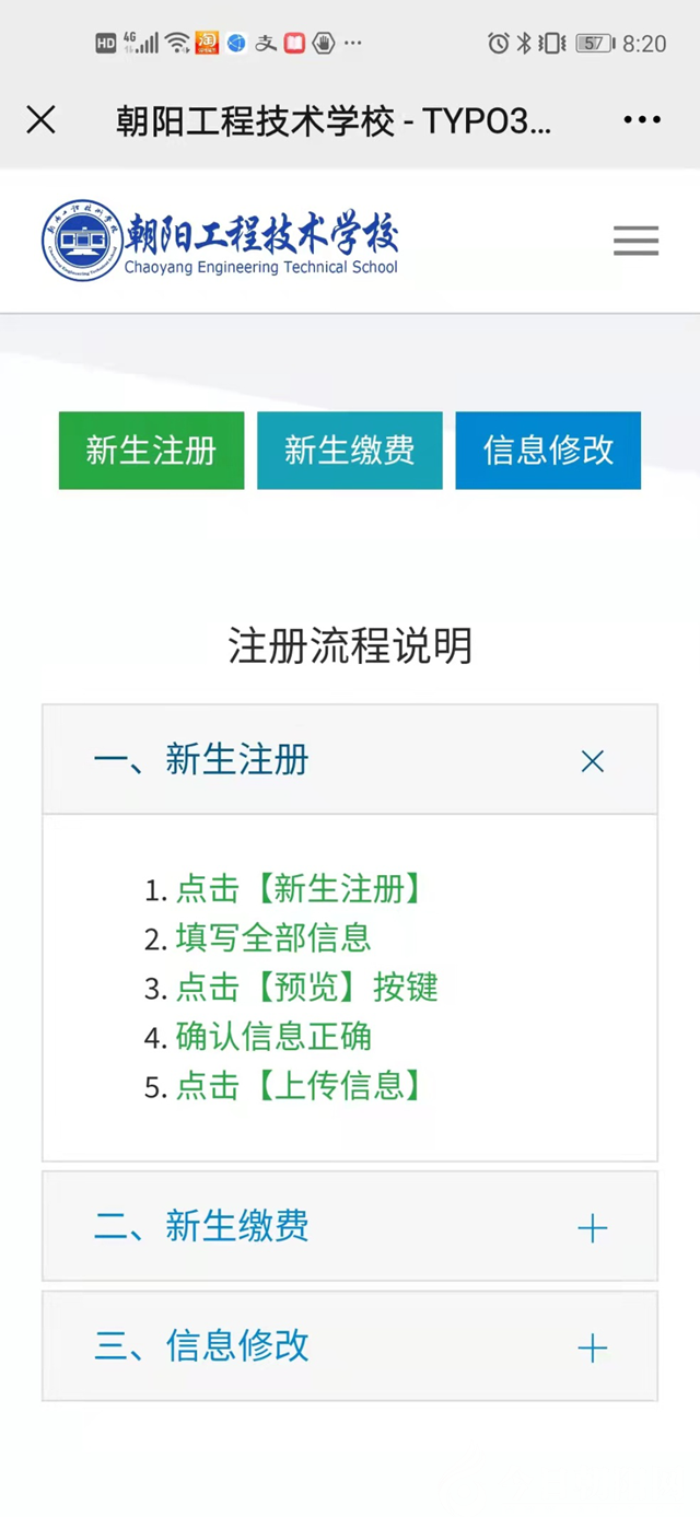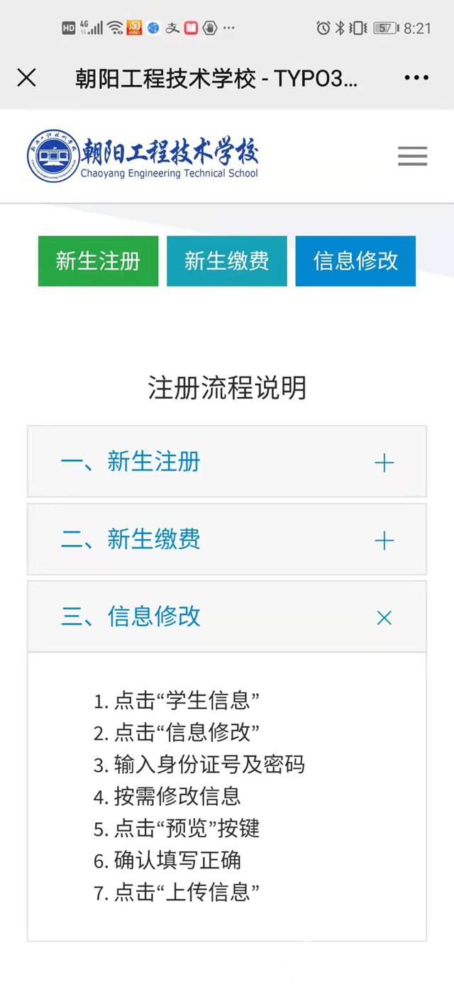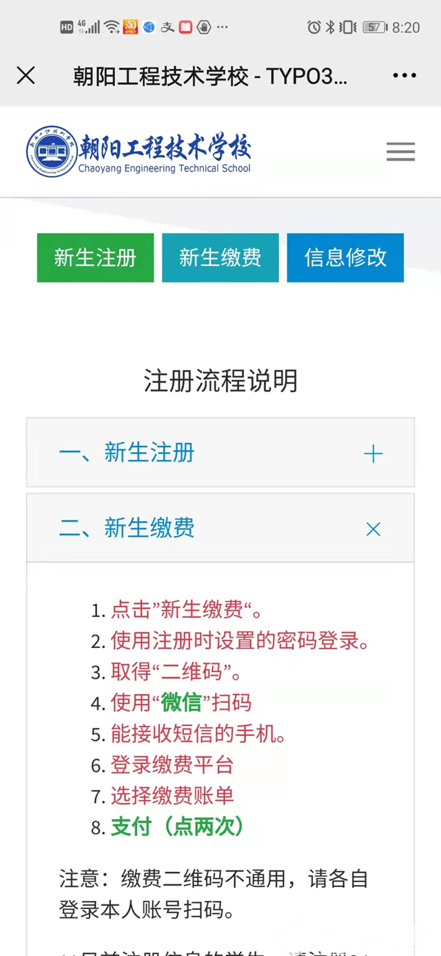 朝陽工程技術學校2021年秋季新生報到實現(xiàn)網上繳費