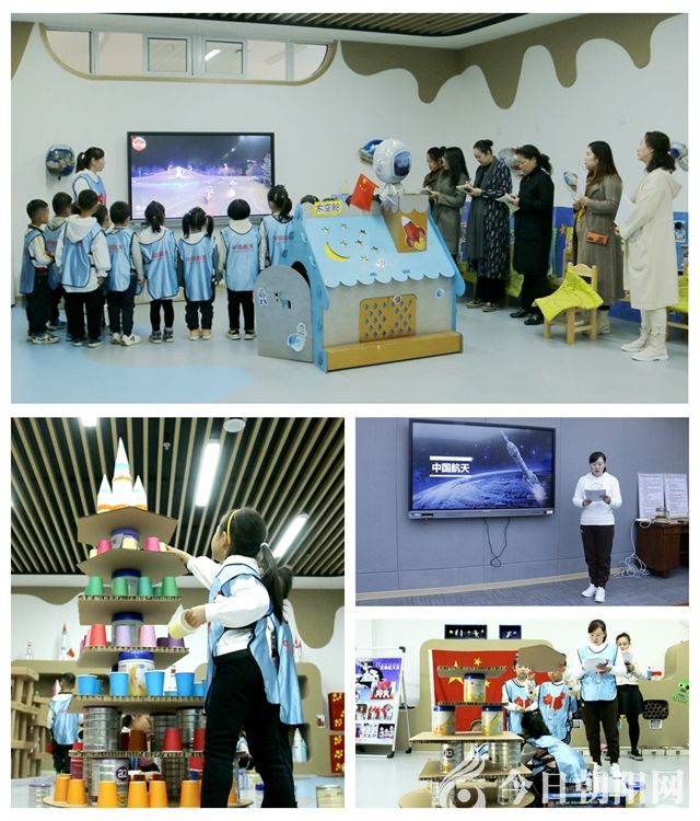 王瑩老師組織的游戲活動是《小小航天科學家》。她通過播放神舟十二號、十三號載人飛船發(fā)射成功的視頻,激發(fā)了小朋友們的愛國情結(jié)。小朋友們通過對火箭的發(fā)射、宇航員的日常生活、太空應(yīng)有的樣子等產(chǎn)生的濃厚興趣,興奮地融入到搭建《中國航天》為主題的活動中。