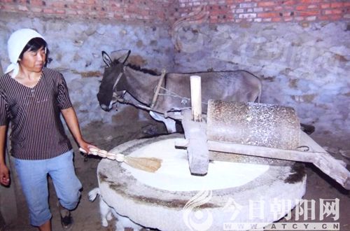 在一個(gè)簡陋的房子里,地中央用大石頭支著一個(gè)直徑2米多的圓形大石板叫碾盤。在碾盤的中央有個(gè)洞,內(nèi)鑲嵌一個(gè)十分堅(jiān)硬的木頭軸叫碾管芯,在碾管芯上掛著一個(gè)四方的木頭框叫碾框;一個(gè)1米長、直徑80厘米的大圓柱石頭叫碾砣子。碾砣與碾框之間用碾碗、碾臍做支點(diǎn)凸凹相接;碾框?qū)歉麒徱粋€(gè)圓孔,孔內(nèi)插根短棍,人一推短棍,近噸重的碾砣在碾框的作用下就開始繞碾盤運(yùn)轉(zhuǎn)。當(dāng)年,也有用毛驢拉碾子的。記得有一則謎語“石頭山,旮旯峪,走一年,出不去”把碾子說得十分形象。
