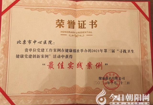 北票市中心醫(yī)院黨建工作案例在健康報社舉辦的2021年第三屆“尋找衛(wèi)生健康黨建創(chuàng)新案例”中,喜獲“最佳實(shí)踐案例”榮譽(yù)。與會領(lǐng)導(dǎo)為獲獎單位頒發(fā)了證書。
