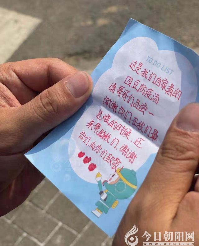 這時(shí),一個(gè)梳著馬尾辮的小女孩雙手捧著一大桶像是飲料的東西站在了安全圍欄外,臉上略帶羞澀。工作現(xiàn)場負(fù)責(zé)人立即迎了上去,小女孩捧著大桶說:“這是我和媽媽熬的綠豆湯,謝謝叔叔和大哥哥們幫助我們,請你們收下吧。”隨后她把大桶放在地上,在右側(cè)的褲兜里拿出了一張彩色的小紙條,她告訴接過綠豆湯的叔叔,這是她自己寫下的一段話,只見上面工工整整地寫道:“這是我們自家煮的四豆防疫湯,請哥哥們品嘗,謝謝你們在我們最為難的時(shí)候,來幫助我們,謝謝你們,向你們致敬!”小女孩離開前高高舉起右手,敬了一個(gè)少先隊(duì)禮。這突如其來的一幕,讓這些無懼風(fēng)雨的男子漢們?yōu)橹畡尤荩业男撵`也隨之震顫和感動,瞬間一股暖流化作淚水模糊了自己的眼睛。