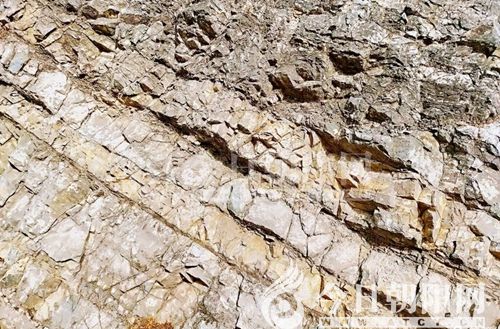 漸至頂峰,遇見(jiàn)一片裸露的山體,巖石層層疊壓,紋理清晰。地質(zhì)構(gòu)造始終是情之所系,遠(yuǎn)古洪荒,這里許是湖泊海域,流水沉積,褶皺斷層,風(fēng)力侵蝕,幾經(jīng)蒼海滄田才能出落如此模樣。