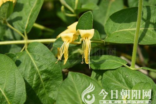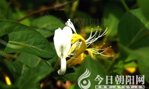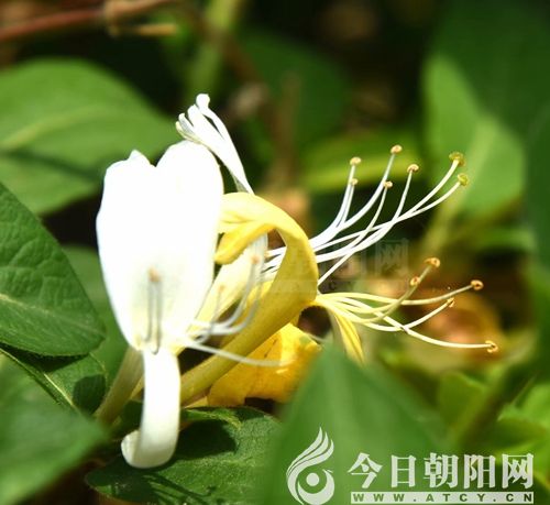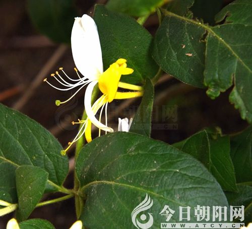 金銀花 ,又名忍冬、雙花等。“金銀花”一名出自《本草綱目》,三月開(kāi)花,微香,蒂帶紅色,花初開(kāi)則色白,經(jīng)一、二日則色黃,故名金銀花。又因?yàn)橐坏俣?,兩條花蕊探在外,成雙成對(duì),形影不離,狀如雄雌相伴,又似鴛鴦對(duì)舞,故有鴛鴦藤之稱。