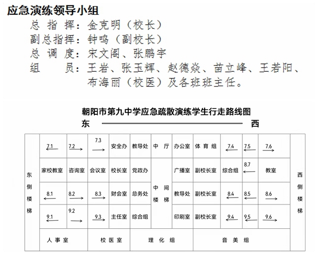 為了組織好本次疏散演練活動(dòng),朝陽(yáng)九中制定了周密的安全疏散演練實(shí)施方案,召開(kāi)了安排部署會(huì)議,成立了由校長(zhǎng)金克明任總指揮、德育副校長(zhǎng)鐘鳴任副總指揮的應(yīng)急疏散演練領(lǐng)導(dǎo)小組。演練前,學(xué)校進(jìn)行了相關(guān)內(nèi)容培訓(xùn):總調(diào)度、安全辦主任宋文革為演練人員和教師講解了演練的方案流程、自救逃生路線等重要事項(xiàng);各班班主任為學(xué)生們講解了防震減災(zāi)知識(shí)、疏散路線和安全區(qū)域。