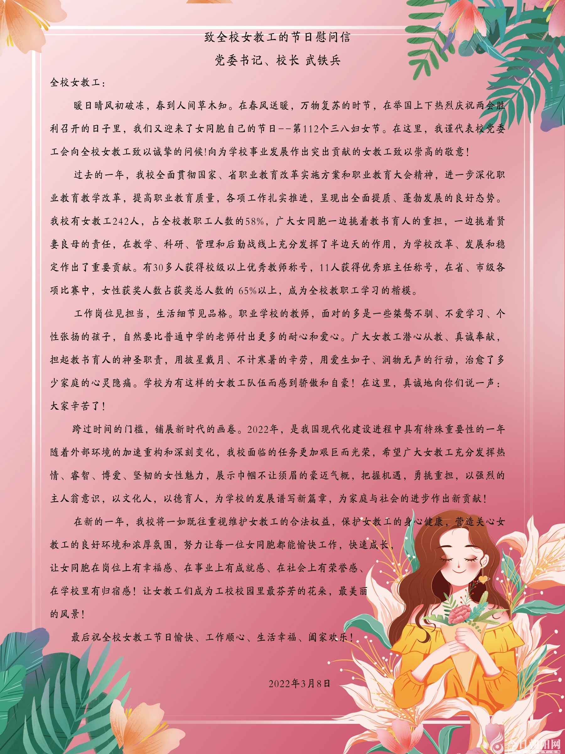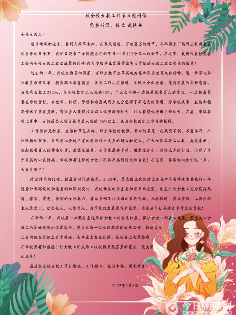 當天早晨,學(xué)校黨委書記、校長武鐵兵代表校黨委和工會發(fā)出了《致全校女教工的節(jié)日慰問信》,向全校女教工致以誠摯問候,對她們?yōu)閷W(xué)校改革、發(fā)展和穩(wěn)定作出的貢獻表示充分肯定,希望廣大女教工發(fā)揮熱情、睿智、博愛、堅韌的女性魅力,展示巾幗不讓須眉的豪邁氣概,為學(xué)校的發(fā)展譜寫新篇章,為家庭與社會的進步作出新貢獻,以優(yōu)異成績向黨的二十大獻禮。