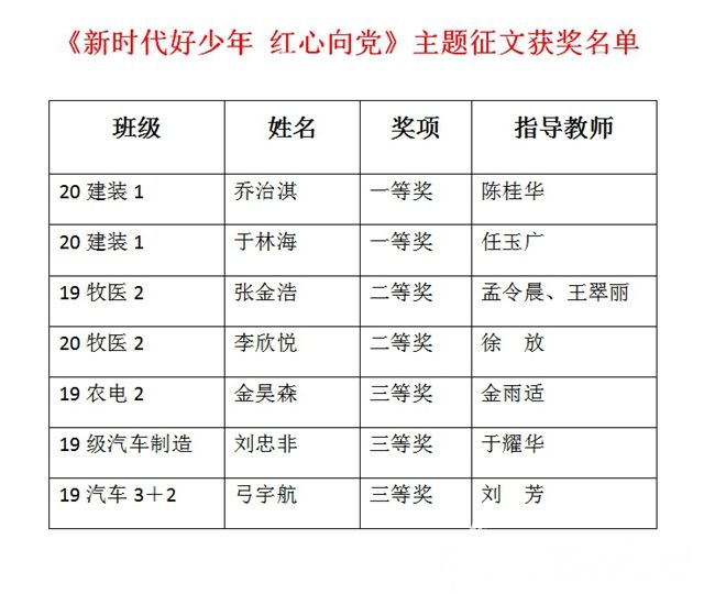 日前,在遼寧省朝陽市委教育工委、市教育局、市關工委舉辦的“新時代好少年·紅心向黨”主題征文活動中,朝陽工程技術學校團委選送了11篇作品,有7篇作品獲獎,其中20建裝1班喬治淇同學的《紅星照我去戰(zhàn)斗》、于林海同學的《他改變了我》榮獲一等獎;19牧醫(yī)2班張金浩同學的《英雄精神照我前行》、20牧醫(yī)2班李欣悅同學的《紅心向黨》榮獲二等獎;19農電2班金昊森同學的《黨在我心》、19級汽車制造班劉忠非同學的《黨旗飄揚》、19汽車3+2班弓宇航同學的《紅心向黨》榮獲三等獎。