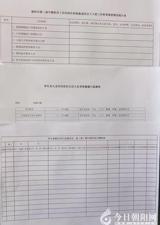 筑牢排查“防火墻”。精準(zhǔn)排查是“外防輸入”的第一關(guān)口。為保障全校師生的生命安全和身體健康,朝陽市三高中對(duì)全校師生進(jìn)行了嚴(yán)格排查:全校師生認(rèn)真填寫了《師生本人及共同居住生活人員身體健康日監(jiān)測(cè)表》;排查六類人員,即《朝陽市第三高中教職員工學(xué)生共同居住的家庭成員六類工作調(diào)查情況統(tǒng)計(jì)》;排查師生共同居住人員出(來)市、出(來)省情況,即《師生家庭共同生活成員出、返(來)朝行蹤信息日摸排表》;在校師生進(jìn)行全員核酸檢測(cè),目前,已經(jīng)進(jìn)行了兩次全員核酸檢測(cè)。