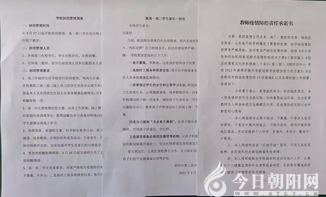 疫情就是命令,嚴(yán)防就是責(zé)任。自3月15日以來,遼寧省朝陽市第三高級(jí)中學(xué)依據(jù)《關(guān)于進(jìn)一步加嚴(yán)當(dāng)前疫情防控工作的通告》和《關(guān)于進(jìn)一步加嚴(yán)當(dāng)前疫情防控工作的補(bǔ)充通告》要求,迅速完善相關(guān)應(yīng)急預(yù)案、起草《學(xué)校封閉管理預(yù)案》,并結(jié)合學(xué)校實(shí)際于3月17日開始全體高三學(xué)生實(shí)行全封閉式管理。