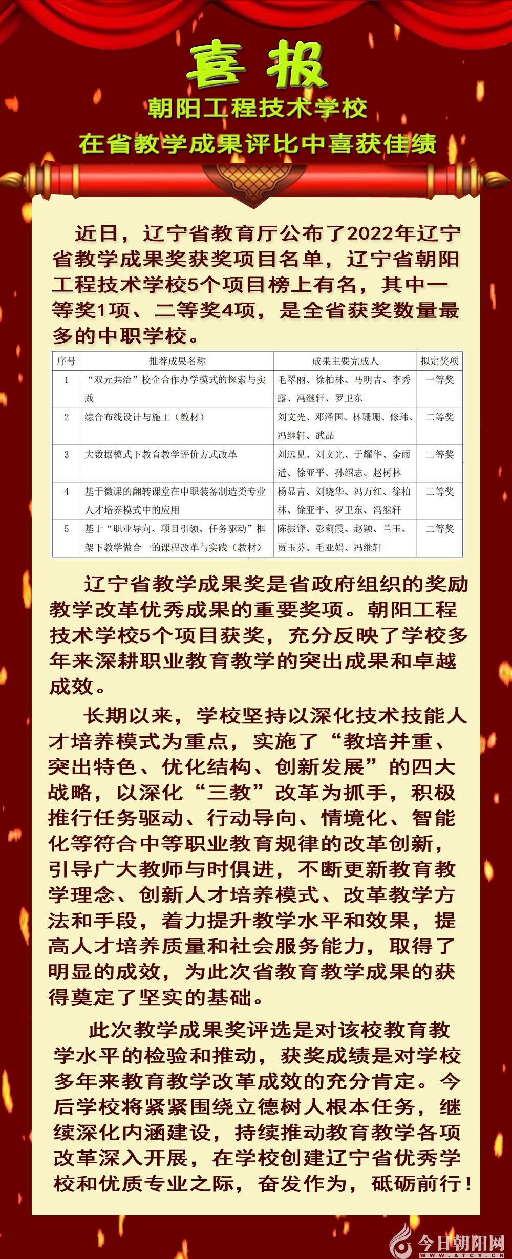 摘要:近日,遼寧省教育廳公布了2022年遼寧省教學(xué)成果獎獲獎項目名單,遼寧省朝陽工程技術(shù)學(xué)校5個項目榜上有名,其中一等獎1項、二等獎4項,獲獎名次及數(shù)量位居朝陽市職業(yè)院校首位。 ?。ū疚膬?nèi)容由遼寧省朝陽工程技術(shù)學(xué)校宣傳中心提供) [編輯 雅賢 編審 春語] 【本網(wǎng)聲明】