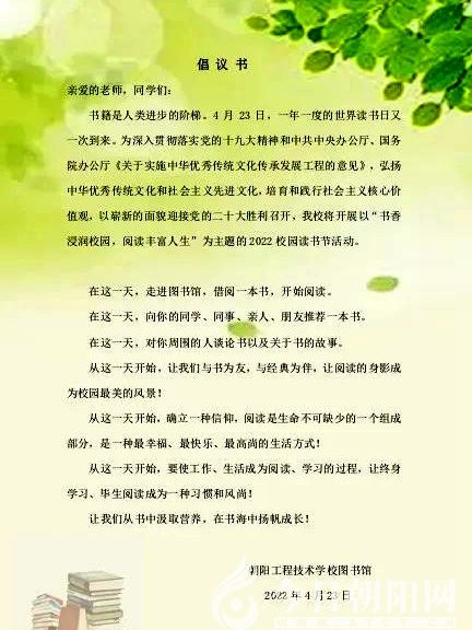 4月23日,校圖書館在線上向全校師生發(fā)出了《倡議書》,希望師生們與書為友,以經典為伴,讓閱讀的身影成為校園最美的風景。