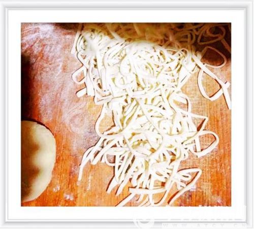 最后便是展示刀功的時候了。自己家吃手搟面,不喜歡吃太細的,反倒是寬一點感覺更好吃些。關(guān)鍵在于每一刀下去,面條都是完好無損的,既不會斷掉,又寬度相同,著實讓我看傻了眼。切完所有的面條,父親用手抖落一下,面條看起來十分松散,一點也不粘連,同時也帶有一種藝術(shù)的美感。誰說藝術(shù)非要是那些高高在上,遠離生活的東西?這不,眼前的手搟面就是門藝術(shù),佩弦先生還說,做夢也是一門藝術(shù)呢。瞧,藝術(shù)之美,無處不在。