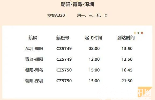 11月28日下午13時50分,一架從深圳起飛,執(zhí)行南航CZ5749航班深圳—青島—朝陽的空客A320飛機,搭載21名乘客平穩(wěn)降落朝陽機場;3個小時后,該機執(zhí)行CZ5750航班搭載旅客起飛返航。至此,在朝陽市委、市政府的積極推動下,朝陽機場深圳—青島—朝陽往返航班正式通航,成功為朝陽、青島、深圳三城架起空中橋梁。