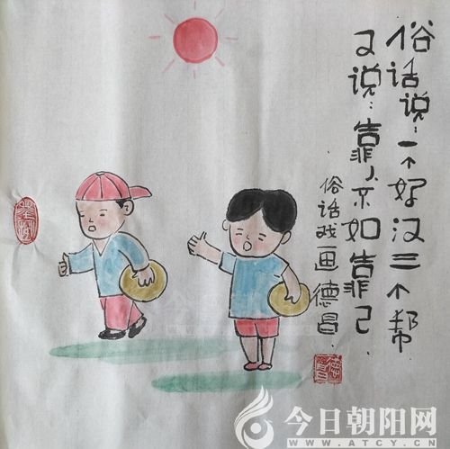范德昌,今日朝陽網(wǎng)文化信使,1955年生于山東濰坊,自幼酷愛書畫?,F(xiàn)為山東省美術(shù)家協(xié)會會員,山東省漫畫協(xié)會理事兼副秘書長,漫畫人生指導(dǎo)老師,《婦女雜志》《女人觀天下》等報刊簽約畫家。30多年來,在全國160余家報刊發(fā)表作品6000余件,260余次獲獎。1994年至今,已岀版12本個人畫集。40多件作品被日本、韓國、新加坡和中國臺灣、香港的企業(yè)家及朋友收藏,被多家新聞媒體譽為扎根基層的民俗畫家,被評為“山東省百名讀書人物”和提名為“百名文化名人”。風(fēng)格獨特、個性鮮明的水墨小品,貼近生活,寓教于樂,深受大眾喜愛。事跡和畫作被收編入《中國人才薈萃》、《二十一世紀人才庫》等8本辭書和傳記,18幅孝文化作品被收編于《銀齡書畫冊》。
