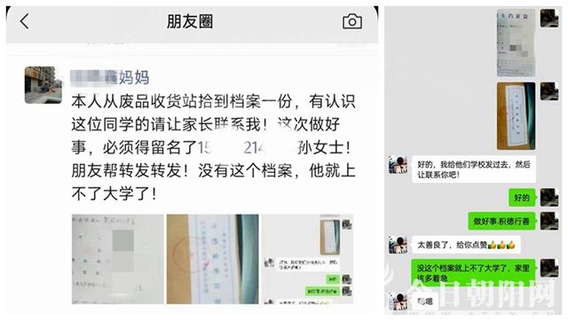 今天,刷朋友圈時(shí)看見兒子初中同學(xué)的家長(zhǎng)發(fā)了消息,要尋找一份檔案的主人。原來愛讀書的她買舊書時(shí),在廢品回收站發(fā)現(xiàn)了一個(gè)檔案袋,檔案封面信息顯示主人系二高中學(xué)生,細(xì)心又善良的她,因?yàn)槭菧?zhǔn)大學(xué)生家長(zhǎng),深知檔案對(duì)一個(gè)學(xué)生的重要性,當(dāng)即花錢買下,將其帶回家,然后火速發(fā)朋友圈尋找檔案的主人。消息一發(fā),朋友圈里的好友被這份善良感染,紛紛行動(dòng)起來,形成了愛心接力。經(jīng)過一番努力,最后終于讓這份重要的檔案物歸原主。檔案的主人拿到檔案非常感動(dòng),當(dāng)即表示到了大學(xué)會(huì)好好學(xué)習(xí),用行動(dòng)回饋社會(huì)。