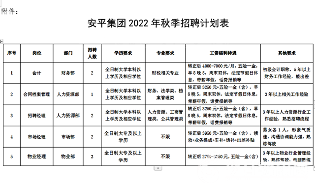 本次招聘人員具體崗位、專業(yè)和學歷要求詳見《安平集團2022年秋季招聘計劃表》(附件)。