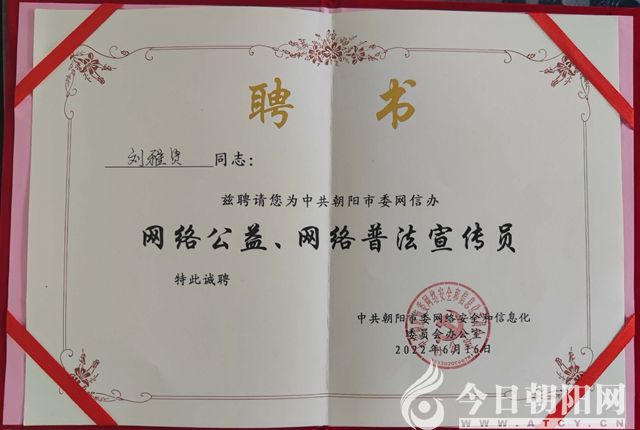 今日朝陽(yáng)網(wǎng)編輯劉雅賢獲聘“網(wǎng)絡(luò)公益、網(wǎng)絡(luò)普法宣傳員”