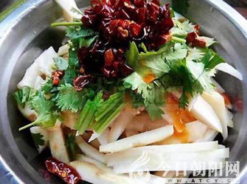 我用水把它沖洗干凈后,切成條狀,在里面放了少許生抽和陳醋,再放一點香油和香菜碎,黃黃綠綠,咸淡適中,可以說色香味俱全。因為嗓子剛好,沒敢放辣椒油,若是淋上一層辣椒油,那就更美味了。