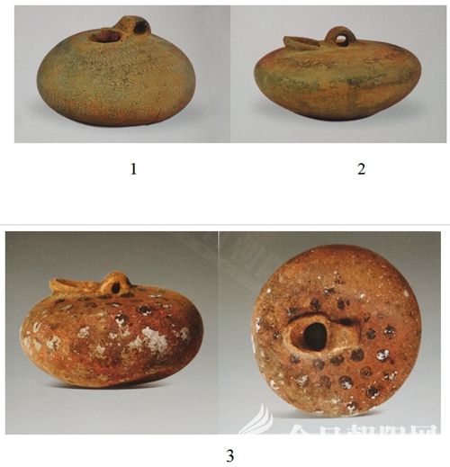 圖四 內(nèi)蒙古敖漢旗博物館藏品及敖漢旗新州博物館藏品[1、“之”字紋彩陶短流提梁壺(敖漢旗博物館藏) 2、彩陶短流提梁壺(敖漢旗博物館藏) 3、短流提梁彩陶壺(敖漢旗新州博物館藏)]這件壺出于敖吉鄉(xiāng)的哈喇海吐紅山文化遺址(圖片選自《新州博物館簡(jiǎn)介》第1頁(yè),屬內(nèi)部印刷品)。這4件標(biāo)本分別在敖漢東南牤牛河流域和敖漢中部的教來(lái)河流域有出土,且均發(fā)現(xiàn)于紅山文化遺址之上,說(shuō)明這種壺的使用范圍較廣,且與日常生活相關(guān)。流正面為瓦溝形,向端漸收出尖,這樣的設(shè)計(jì)在從壺里往外傾倒時(shí)便不會(huì)四溢而集中成流線狀注入飲具里。敖漢旗新州博物館藏:短流提梁彩陶壺,紅山文化時(shí)期,泥質(zhì)紅陶,共同特點(diǎn)是扁圓體,頂偏一側(cè)有外侈的小流,連橋狀小提梁,繞頂點(diǎn)黑色圓點(diǎn)共五排,平底。此類(lèi)壺帶流也是盛珍貴飲品的器皿,進(jìn)一步說(shuō)明在五千年前既有控制流量的類(lèi)似酒的飲料存在。此類(lèi)器物只有一個(gè)進(jìn)出口,應(yīng)與漏斗配套使用。頂出一橋形提梁是為提攜方便和掌握傾注的角度。這類(lèi)壺當(dāng)為分酒具。