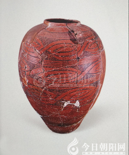圖六:牛河梁遺址出土的帶蓋彩陶甕(罍)敖漢旗第二次文物普查中,在薩力巴鄉(xiāng)的一處紅山文化遺址中采集一件高達(dá)64厘米小口彩陶,肩上加雙耳,亦當(dāng)為儲(chǔ)酒器[11](圖七)。