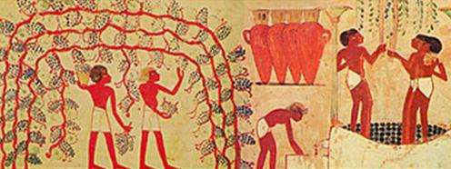 在尼羅河河谷地帶,從發(fā)掘的墓葬群中,考古學(xué)家發(fā)現(xiàn)一種距今5000多年前,底部小圓,肚粗圓,上部頸口大的盛裝液體的陶器陪葬物品。經(jīng)考證,這是古埃及人用來(lái)存放葡萄酒的土陶罐。特別是浮雕中清楚地描繪了古埃及人栽培、采集葡萄,釀制步驟和飲用葡萄酒的情景(圖九)[13]。
