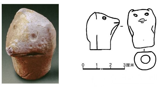在距今8000年左右的興隆洼文化時(shí)期的先民們,就對(duì)熊進(jìn)行藝術(shù)化創(chuàng)作加以美化,如白音長(zhǎng)汗遺址便發(fā)掘了一件用白石料圓雕出一件熊首[23],形象逼真。這應(yīng)是一件類(lèi)似杖首的部件,說(shuō)明當(dāng)時(shí)人們已經(jīng)將熊當(dāng)做位置很高的神來(lái)崇拜(圖十)。