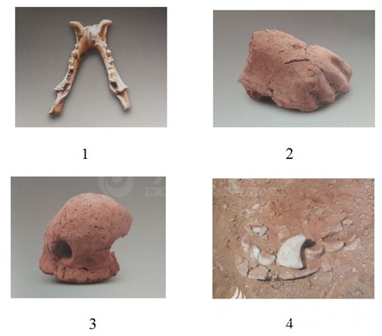 圖十二:牛河梁女神廟遺址出土的泥塑熊殘件和灰坑出土的黑熊下頜骨(1.黑熊下頜骨;2.泥塑熊爪;3.泥塑熊吻部;4.泥塑熊下頜骨殘件)說(shuō)明了在其祖廟這樣神圣的廟里,竟有熊神的尊位,熊成了紅山人不可替代的“圖騰”。熊頭骨的存在,代表紅山人崇拜的熊神偶像;代表氏族的圖騰,體現(xiàn)著以熊為部落祖先的血緣觀念;代表的是熊神使者,即人與熊神溝通的中介物 [26]。其次才是鳥(niǎo)的泥塑像。有學(xué)者甚至由此認(rèn)為紅山先民即為“有熊氏”,也就是黃帝族的“圖騰”,具有一定的道理。