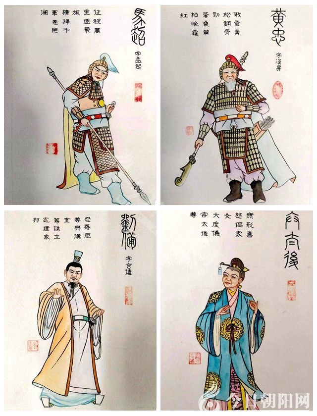 劉玉旻退休后,便專心作畫,筆墨傳神。先期完成了計劃中的380位三國人物素描。后來在曹永玲、董江濤夫婦的建議下,歷時11個月完成了438幅彩墨人物工筆畫像。他說:“最難的是每幅畫中的對聯(lián),先選定幾位人物,閱讀相關(guān)資料,再把描述人物的大量文字,濃縮到14副必須對仗的對聯(lián)里。當(dāng)一副對聯(lián)完成后,開始繪畫,并用篆字將人物名字和對聯(lián)填寫到畫中。”仔細(xì)端詳每幅人物工筆畫,各有千秋,獨具特色,用篆字書寫楹聯(lián)名字,更非一日之功。