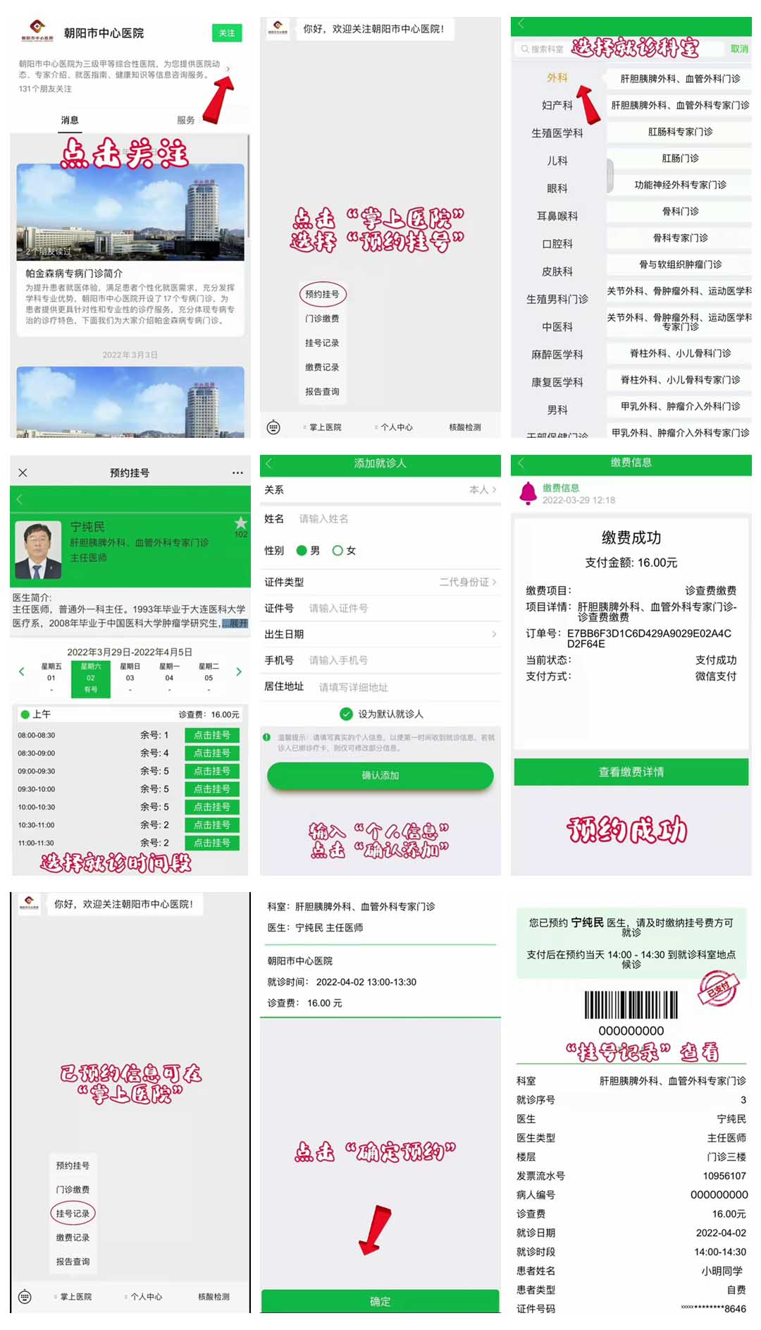 關(guān)注朝陽市中心醫(yī)院微信公眾號或下載朝陽市中心醫(yī)院APP(老用戶請重新下載更新),進入“預約掛號”界面后,仔細閱讀掛號須知并確認,選擇科室及醫(yī)生,您會看到每位醫(yī)生號源分時段依次列出,可根據(jù)自身需要進行預約。
