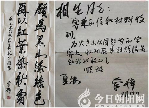 我剛開始收藏的時(shí)候,就了解到管樺先生不僅是作家、詩(shī)人,而且寫書法,畫墨竹。也很想收藏一幅他的作品,或書或畫我都求之不得,可是苦于一直聯(lián)系不上。直到1998年8月初才找到管老的住址,并給管老寫了一封求字信,同時(shí)寄去了北票大黑山的簡(jiǎn)介資料。8月21日收到了管老為大黑山創(chuàng)作的一幅8平方尺的中堂,內(nèi)容是“愿為黑山添綠色,再以紅葉染秋霜”。并用毛筆給我寫了一封回信:“相生同志,寄來的信和材料收到。為大黑山公園題寫的字寄上,收到后來封短信告知,我就放心了。順致,夏安。8月17日。”