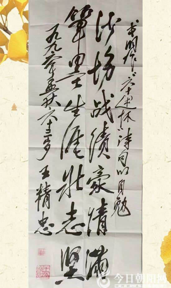 王精忠不但是著名作家,還是一位書法家。1996年他接到我的求字信后,給我寄來一張“朝鮮上甘嶺戰(zhàn)役留影”的照片。同時(shí)寫了一幅作品寄來,內(nèi)容是“沙場戰(zhàn)績豪情滿 筆墨生涯壯志堅(jiān)”。題上款“書舊作《六十述懷》詩句以自勉”。下款“一九九六年孟秋六十三歲,王精忠”。這么多年,每當(dāng)看到他的照片和作品,我就想起了黃繼光,想起了邱少云,想起了上甘嶺的英雄兒女們,想起了那些最可愛的人。
