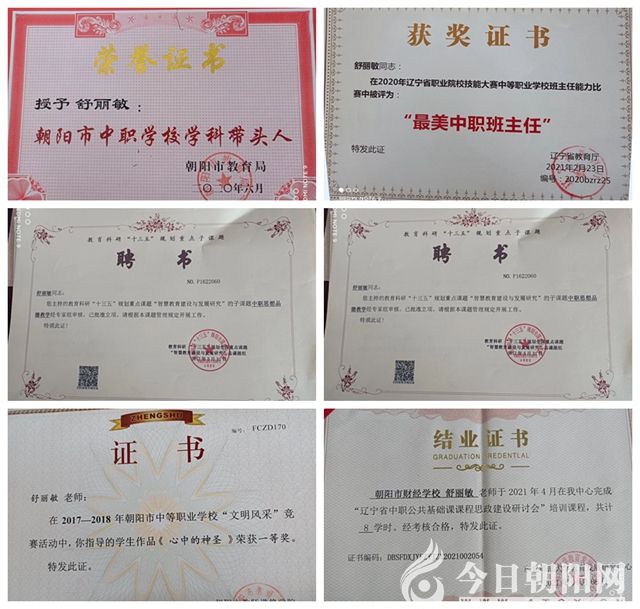 “借他山之石,琢己身之玉。”她認(rèn)為教師不能滿足于做教書匠,而是要當(dāng)學(xué)習(xí)型、專家型教師。為此,她積極參與各種教研活動和各級各類比賽,比賽中洗禮、提高、打磨自己,取得了優(yōu)異成績,先后獲評全國“文明風(fēng)采”大賽“優(yōu)秀指導(dǎo)教師”、遼寧省教育廳中等職業(yè)學(xué)校“文明風(fēng)采先進個人”、朝陽市思政學(xué)科帶頭人、朝陽市“教學(xué)能手”、朝陽市“優(yōu)秀教師”、遼寧省職業(yè)院校最美中職班主任等多項榮譽和稱號。2022年,申報的《談社會主義核心價值觀與學(xué)生德育之融合》獲國家級教育科研成果一等獎,并多次參與中職學(xué)校德育教材的編輯工作。2022年,她帶領(lǐng)的思政教學(xué)團隊在遼寧省中等職業(yè)學(xué)校思政學(xué)科教師技能大賽中一路領(lǐng)先,代表遼寧省參加全國中職學(xué)校思政學(xué)科教師技能大賽。