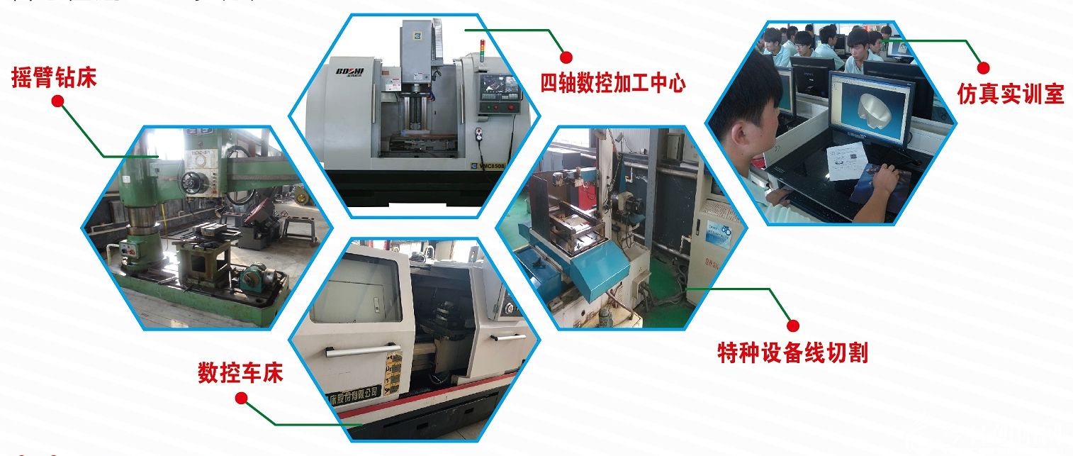 校內(nèi)實訓(xùn)基地建筑面積2400平方米,包含2個實訓(xùn)車間和2個CAD/CAM實訓(xùn)室。擁有數(shù)控車床20臺、立式加工中心4臺、全功能數(shù)控車床1臺、車銑中心1臺、線切割1臺、普通車床30臺和普通銑床、普通磨床、鉆床等多種先進的生產(chǎn)實訓(xùn)設(shè)備,實訓(xùn)設(shè)備總值達1500多萬元。