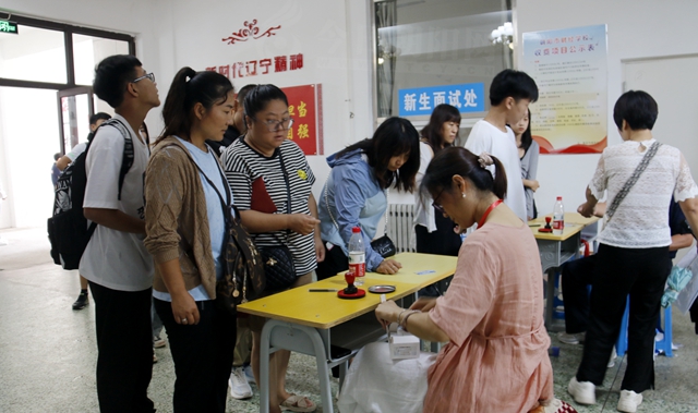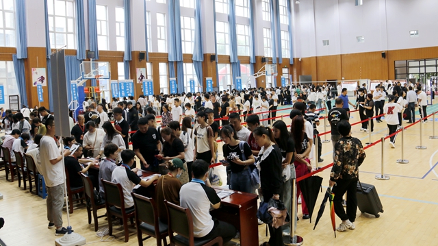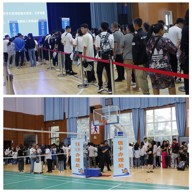 新生報(bào)到處設(shè)在寬敞的體藝館內(nèi)。精心布置過(guò)的體藝館,清晰劃分出數(shù)個(gè)功能區(qū),按著指引標(biāo)識(shí),新生們按照?qǐng)?bào)到流程依次完成面試、填表注冊(cè)、編入班級(jí)、繳費(fèi)領(lǐng)卡、領(lǐng)取物品等流程。住宿生在志愿者的引領(lǐng)和幫助下有序入住宿舍。