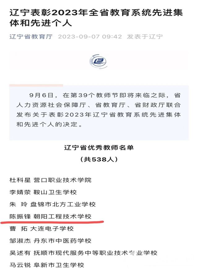 在第39個(gè)教師節(jié)即將來臨之際,遼寧省人力資源社會保障廳、省教育廳、省財(cái)政廳聯(lián)合發(fā)布關(guān)于表彰2023年遼寧省教育系統(tǒng)先進(jìn)集體和先進(jìn)個(gè)人的決定。朝陽工程技術(shù)學(xué)校教師陳振鋒榮獲“遼寧省優(yōu)秀教師”稱號。