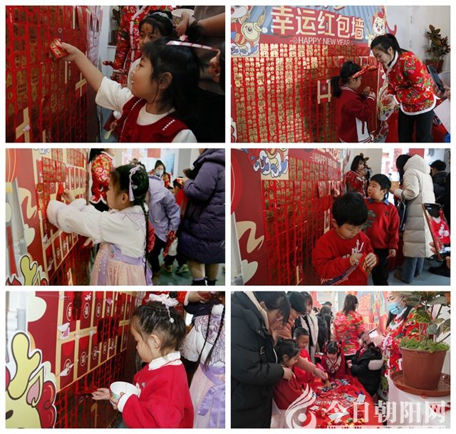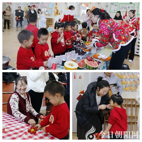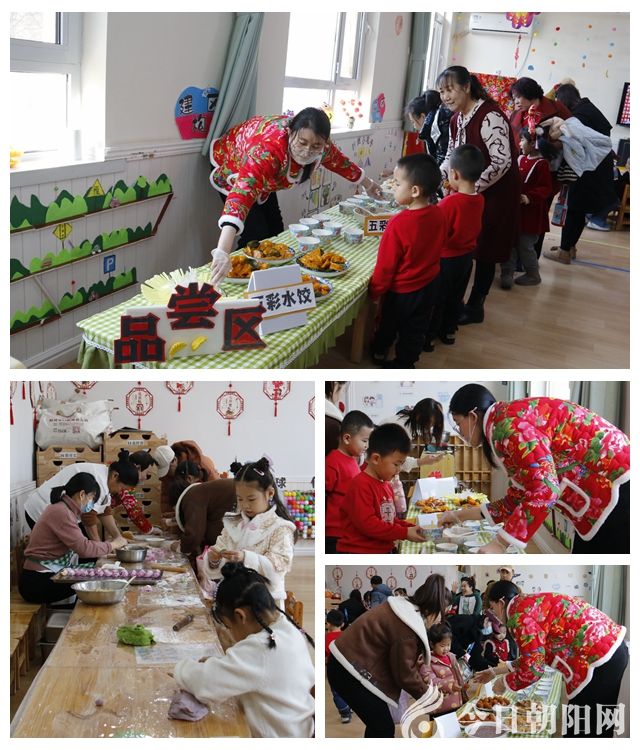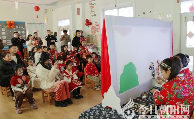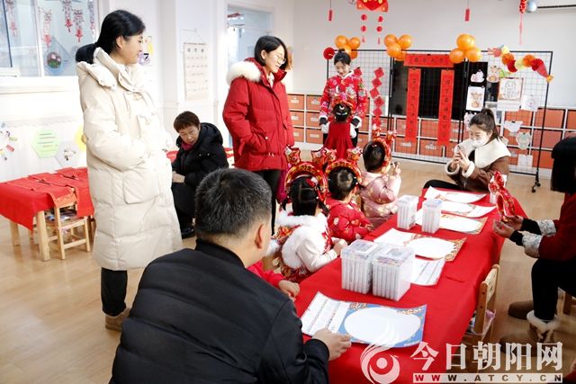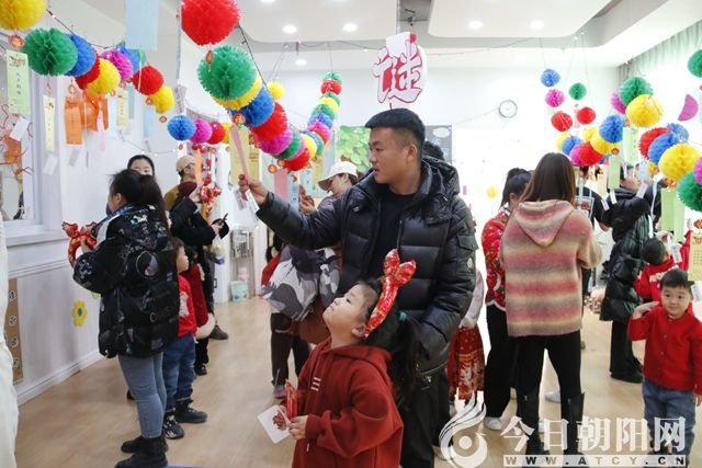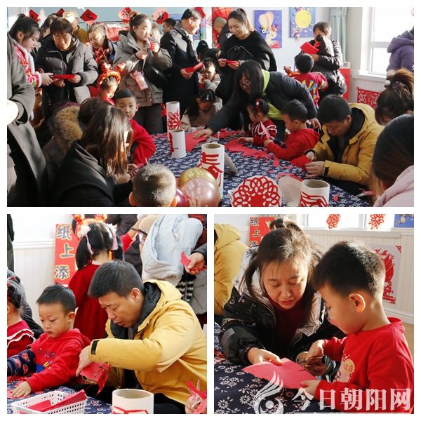 室內(nèi)活動的每個(gè)區(qū)域都聚滿了家長和幼兒,吶喊聲、歡笑聲此起彼伏,剪窗花、寫福字、包餃子、制作棉花糖、看皮影戲、猜燈謎、扭秧歌這一系列民俗活動將喜慶氣氛推向了高潮。