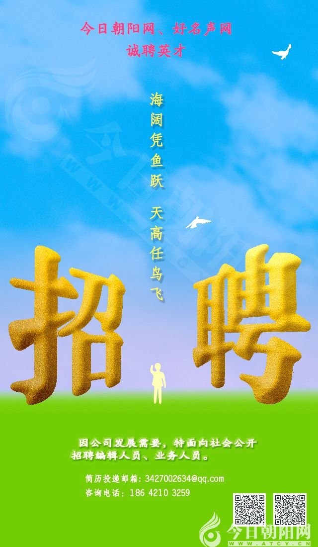 今日朝陽(yáng)網(wǎng)、好名聲網(wǎng)隸屬于朝陽(yáng)云時(shí)代文化信息傳播有限公司,因公司發(fā)展需要,特面向社會(huì)公開(kāi)招聘編輯人員、業(yè)務(wù)人員。報(bào)名時(shí)間從3月13日開(kāi)始,額滿(mǎn)為止。