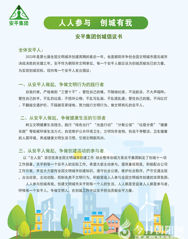 安平集團(tuán)把創(chuàng)城當(dāng)作日常工作來抓,多次召開部門會(huì)議,制定詳實(shí)的工作方案、落實(shí)主體責(zé)任,印發(fā)了創(chuàng)建文明城市倡議書,并就個(gè)人衛(wèi)生問題排查、公司衛(wèi)生大清理、消防安全排查、推行電子化進(jìn)程、啟動(dòng)“全民閱讀”行動(dòng)等事項(xiàng)做出具體部署,呼吁全體員工牢固樹立創(chuàng)城人人有責(zé)的意識(shí),積極踐行社會(huì)主義核心價(jià)值觀,自覺傳承中華民族傳統(tǒng)美德,以得體的文明言行,塑造朝陽人、安平人文明形象,在創(chuàng)城工作中貢獻(xiàn)應(yīng)有力量。