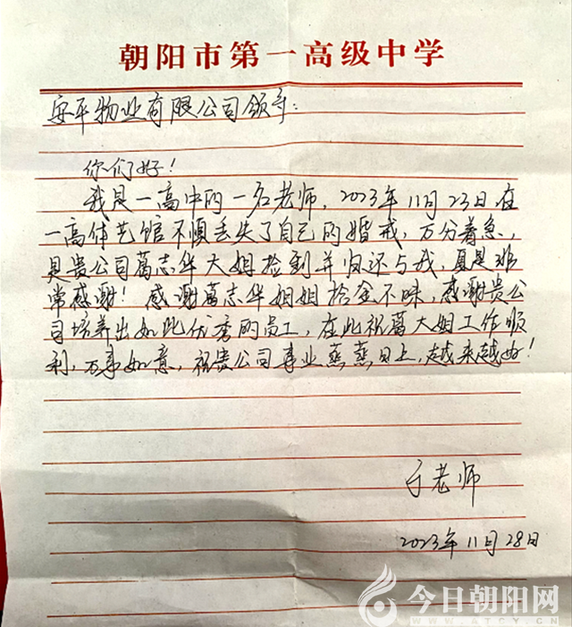 事情的經過是這樣的:11月28日,安平集團駐朝陽市第一高級中學保潔員葛志華在打掃學校體藝館衛(wèi)生的時候,撿到了一枚戒指。她想到失主一定會很著急,立即上報學校后勤部。經過多方聯系,第一時間將戒指交還給失主于老師。