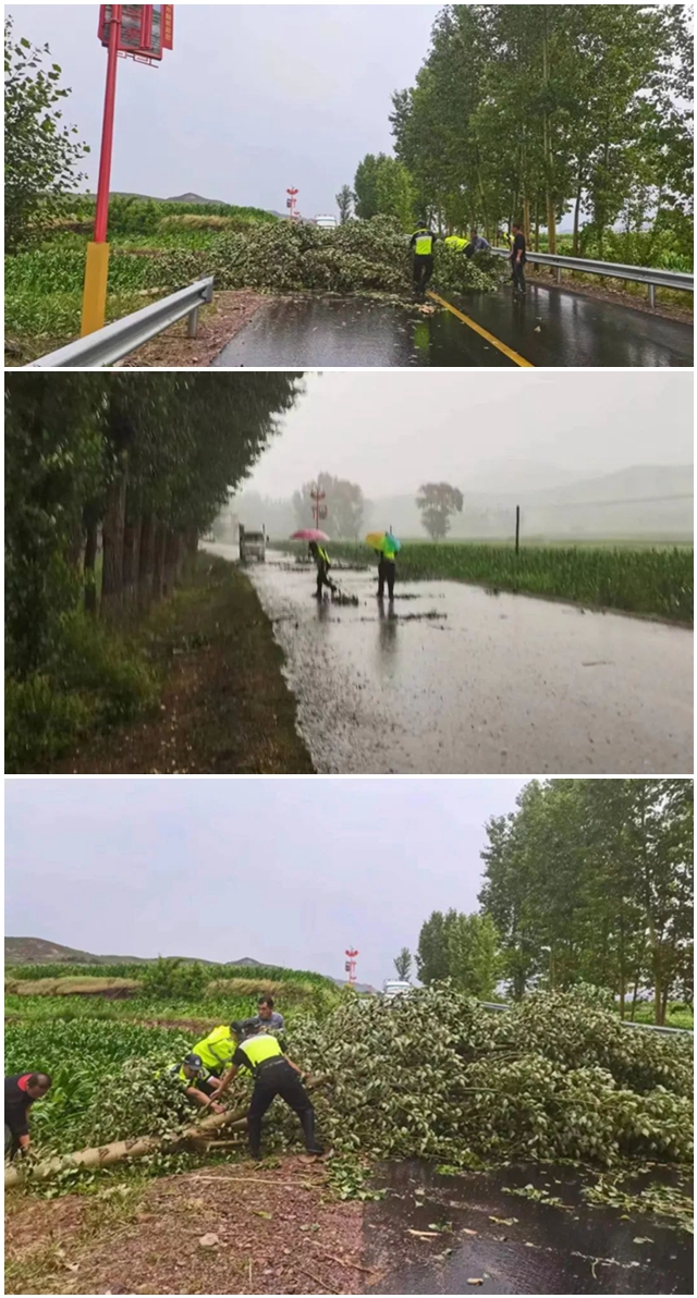 7月7日下午15時許,交警大隊大黑山中隊巡邏至桃萊線21公里處時,發(fā)現(xiàn)路邊一棵大樹被大風刮折橫在路面,阻礙了車輛通行。為減少攔路樹木對出行的影響,避免交通事故發(fā)生,大黑山中隊巡邏隊員立即下車進行清理,在過往群眾的幫助下,刮倒的樹木很快被大家齊心協(xié)力推至路邊,最終安全隱患得以消除,道路恢復(fù)正常。