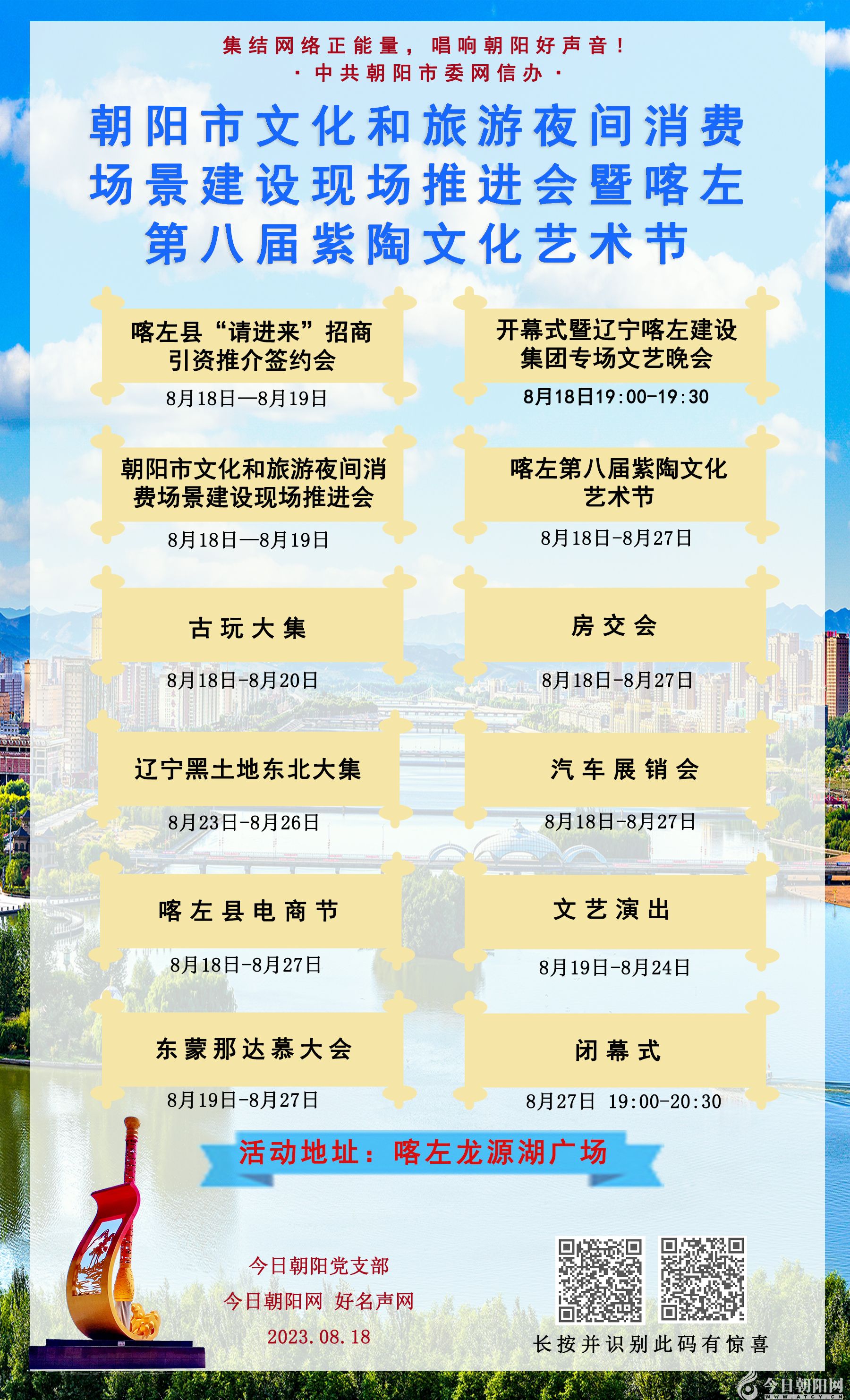 請各位網(wǎng)友記住兩個關(guān)鍵詞。一是活動時間:2023年8月18日—8月27日。二是活動主題:紫陶之都 塞外水城 龍源喀左。