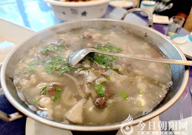 喀左羊雜湯是一道獨(dú)具特色的地方小吃,湯鮮而不膻,肉香而不膩,營養(yǎng)滋補(bǔ),風(fēng)味獨(dú)特。羊雜以羊骨湯為原汁,把煮好的羊頭肉、羊肚、羊百葉、羊血、羊肝等切成條狀,經(jīng)沸騰的底湯浸泡后放入碗中,再加上原汁,就做成了一碗熱氣騰騰的羊雜湯。顧客可根據(jù)自己的口味加上鹽、胡椒粉、辣椒末、香菜等,配著煎餅和燒餅一起吃,口感更為美好。