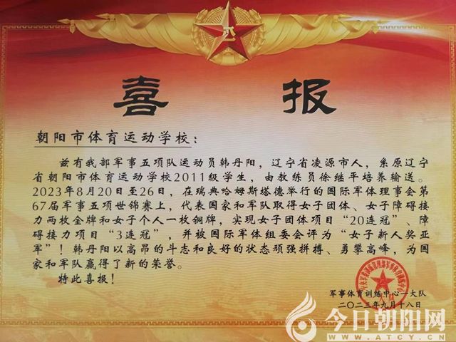 日前,中央軍委訓(xùn)練管理部軍事體育訓(xùn)練中心一大隊(duì)向遼寧省朝陽(yáng)市體育運(yùn)動(dòng)學(xué)校發(fā)來(lái)喜報(bào):2023年8月20日至26日,該校輸送的運(yùn)動(dòng)員韓丹陽(yáng)在瑞典哈爾姆斯塔德舉行的國(guó)際軍體理事會(huì)第67屆軍事五項(xiàng)世錦賽上,代表國(guó)家和軍隊(duì)取得女子團(tuán)體、女子障礙接力兩枚金牌和女子個(gè)人一枚銅牌,實(shí)現(xiàn)女子團(tuán)體項(xiàng)目“20連冠”、障礙接力項(xiàng)目“3連冠”,并被國(guó)際軍體組委會(huì)評(píng)為“女子新人獎(jiǎng)亞軍”。
