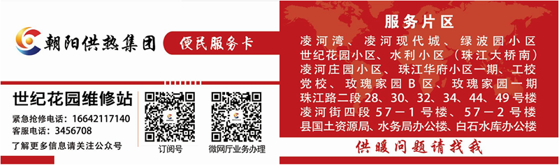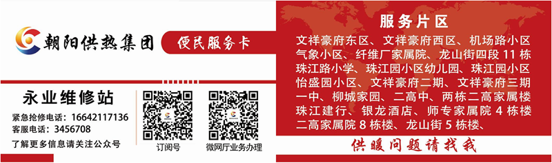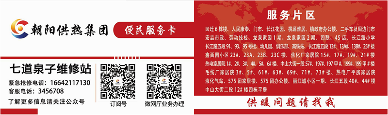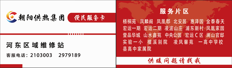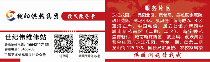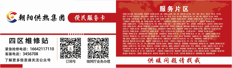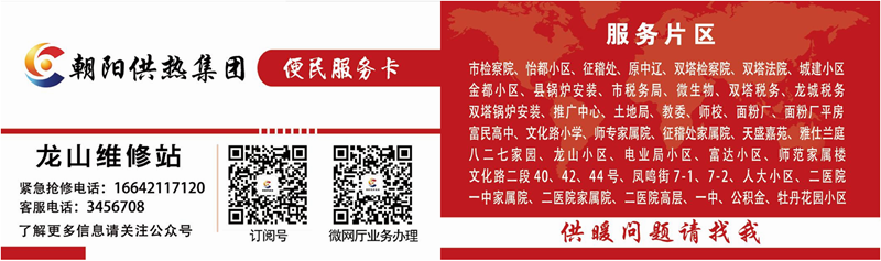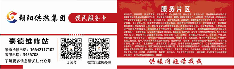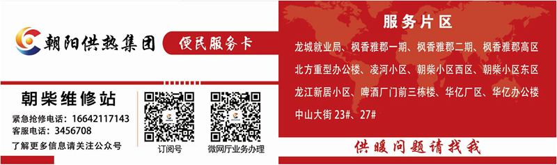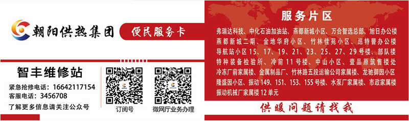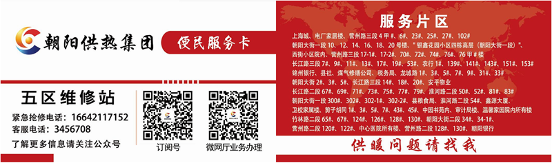 今冬供暖季即將到來,為暢通群眾訴求渠道,及時解決群眾在供暖過程中遇到的問題,在朝陽市供暖工作服務(wù)中心的統(tǒng)籌安排下,朝陽市城區(qū)集中供熱集團有限公司印發(fā)了“供暖便民服務(wù)卡”,如市民朋友遇到供暖問題,可及時撥打所在片區(qū)的維修電話,會有專人上門維修。