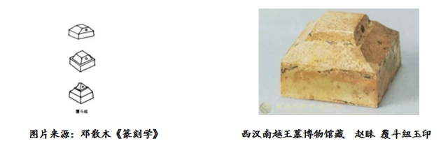 覆斗造型源于房屋與墓冢建筑,由此,古代帝王行旅征戰(zhàn)所用車輿、帳篷之華蓋(也稱覆斗),皆此形。象征身份和權(quán)力地位的官方、個人印鈕也作覆斗形。覆斗鈕是我國最早出現(xiàn)的幾種印璽鈕式之一?,F(xiàn)有西漢前期印章的鈕式絕大多數(shù)是覆斗鈕,尤其是姓名印,更經(jīng)常地用到這種鈕式。