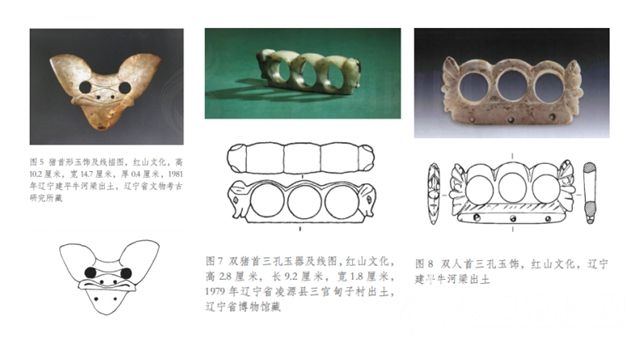 董婕、朱成杰所著《牛河梁紅山文化遺址建筑設計思想研究》一書中說,紅山文化的北斗信仰可以追溯到興隆洼文化早期,“北斗竟然與石龍(查海石堆龍)的方位完全吻合。不僅方向吻合,而且龍頭正好處在斗魁之中,龍身龍尾也與斗柄基本吻合。”⒇牛河梁第一地點和第十三地點之間安置第二、三、四、五、十、十一、十二這7個地點,這9個遺址地點的連線就是標準的反S形曲線。7個地點構(gòu)成北斗形狀,其中,“(5號地點)是牛河梁遺址主體布局的中心。以該地點為中心的7個積石冢地點象征北斗7星“運轉(zhuǎn)”在天地之間”。?(見下圖)也就是說,積石冢埋葬之初就是按照北斗之形設計的。作為天象,北斗在早期中華文明中已經(jīng)被賦予了具體的形象,被神化了。陸思賢在《神話考古》中談到:在遼寧牛河梁第二地點一號積石冢的第21號墓中,出土了一件豬面形玉飾,用淡綠色玉琢成,扁體光潔,很有靈氣,通高10.2、最闊14.7厘米,也算是一件重器了。原報告說“神秘莊重,線條簡潔明快”。郭大順認為是取形于豬龍的面部。突出豬的大耳朵,又雕琢了一個大嘴巴,此嘴巴卻不是豬嘴,而有點像人嘴,應是已半人格化的豬靈;嘴巴的上下各刻了2顆星辰,總4顆,如果用線連起來,豈不是一個斗魁么?原來此半人格化的豬靈玉飾是北斗星君。?此斗魁正為一倒梯形的覆斗形狀。另外,在上述第21號墓和牛河梁腳下的三官甸子紅山文化墓地中,還發(fā)現(xiàn)了兩件形狀相似的三孔禮器,不同的是,前者為雙人首,后者為雙豬首(見下圖)。閻安先生認為,“假如我們將豬首作為斗魁四星的象征來看,玉器中央的三個圓孔就可以視為從斗魁引出的斗杓三星,……這兩件紅山玉器的互相映證,不僅說明了斗魁與豬形的關系,也說明了斗在此時已被神話,更說明了紅山人將豬頭神或斗神,加上三星,形成了一個完整的七星北斗狀禮器。”?