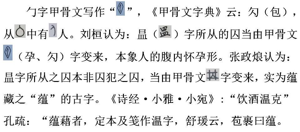 甲骨文身孕一字,《甲骨文字典》:從人而隆其腹,以示其有孕之形,本義當為妊娠,或作腹內有子形,則其義尤顯。孕婦之腹特大,故身亦可指腹,腹為人體主要部分,引申之人之全體亦可稱身,《說文》:“身,躳也,象人之身。”《易·艮》:“艮其身”虞注:“身,腹也。或謂妊娠也。”均是。②冢上之冖,即由孕之乃演化而來。